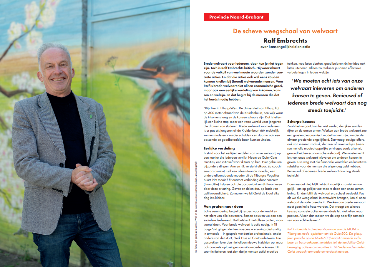Ralf Embrechts is directeur-buurman van de MOM in Tilburg en mede-oprichter van de Quiet500. De glossy (een parodie op de Quote500) maakt armoede zichtbaar en bespreekbaar. Inmiddels telt de landelijke Quiet-beweging actieve communities in 14 Nederlandse steden. Quiet verzacht armoede en versterkt mensen.