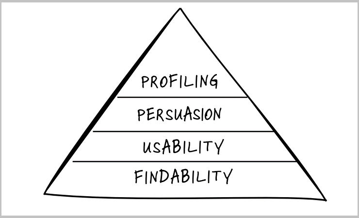 Het begint allemaal met de ‘conversiepiramide’. Met conversie bedoelen we omzetting, ofwel het omzetten van een bezoek in een actie (zoals een aanmelding, download, contactaanvraag, inschrijving, boeking, bestelling of betaling). De basis van de piramide is ‘findability’. Vindbaar zijn in Google is jouw lifeline. Dus: Wat is je businessdoel en welke segmenten (doelgroepen) gaan je helpen je doel te behalen? Breng per segment in kaart hoe zij zoeken: Waar zijn ze naar op zoek? Welke woorden gebruiken ze? ‘Usability’ betekent dat een bezoeker zonder nadenken zijn taak moet kunnen uitvoeren, of zoals informatiearchitect Steve Krug schreef in zijn gelijknamige usability-bijbel: ‘Don’t make me think’.