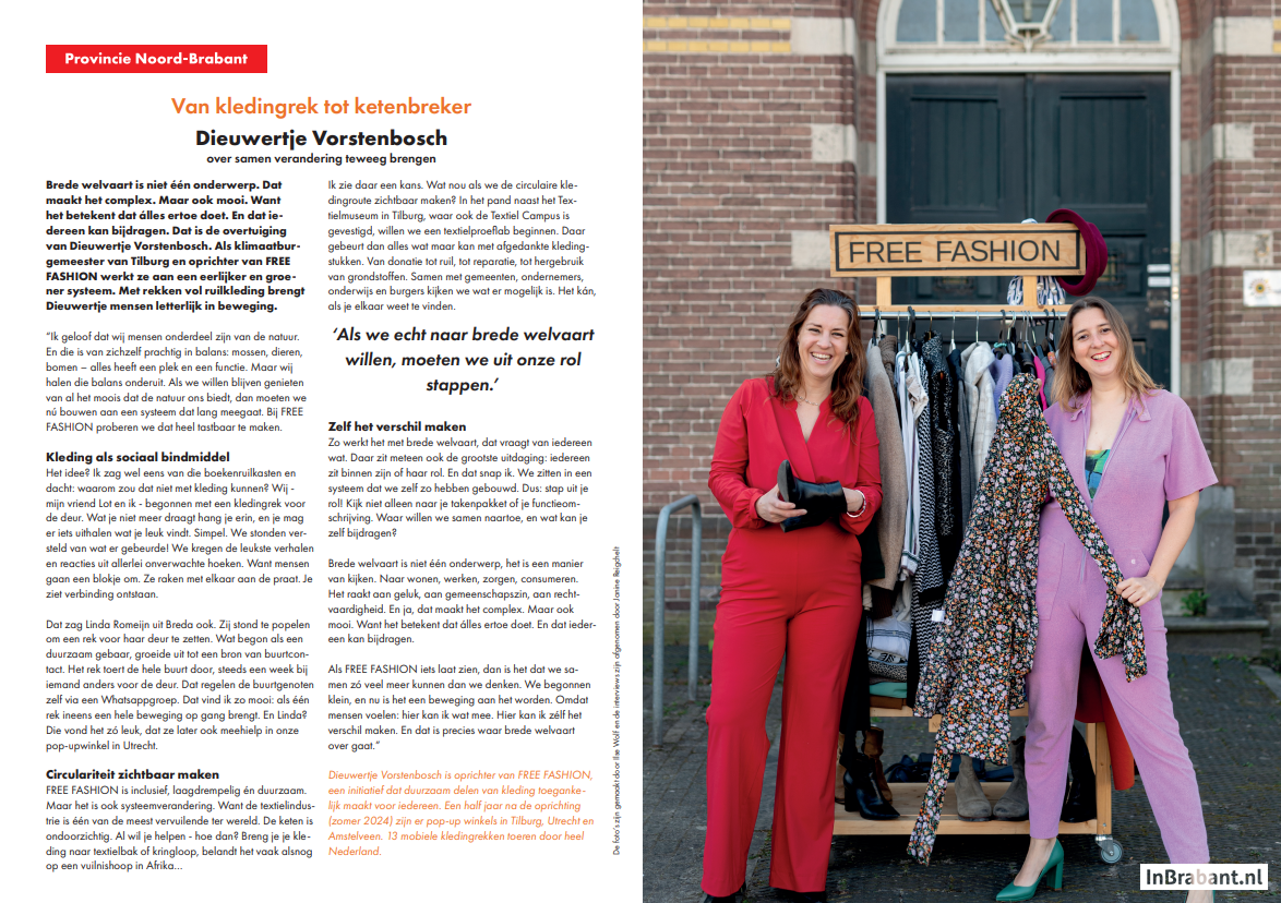 Dieuwertje Vorstenbosch is oprichter van FREE FASHION, een initiatief dat duurzaam delen van kleding toegankelijk maakt voor iedereen. Een half jaar na de oprichting (zomer 2024) zijn er pop-up winkels in Tilburg, Utrecht en Amstelveen. 13 mobiele kledingrekken touren door heel Nederland.