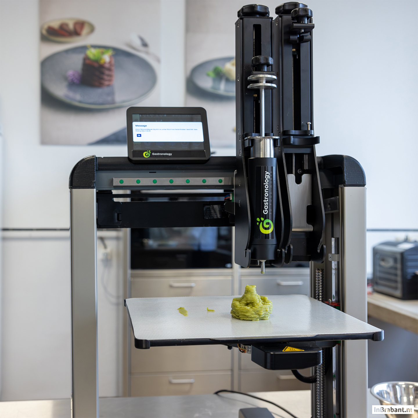 Inmiddels bestaan er heel wat producten gemaakt met een 3D-printer, maar hoe werkt dat met voedsel? Eugène Swalen: “We maken puree van minimaal 95% verse groenten plus een bindmiddel. Dit gaat in een spuit, waarna een 3D-printer er broccoli van print. Deze printer kan vormen maken die je met mallen nooit kunt maken. Het product wordt ingevroren met de shockvriezer en verpakt in doosjes van een kilo. De zorginstelling ontvangt het product diepgevroren. Zij hoeven de maaltijd nu enkel in de oven te doen op 95 graden voor 55 minuten en dan is het klaar om te serveren. Elk stukje groente is vijftig gram, dus een patiënt kan zelf aangeven hoeveel hij wil eten. Toen ik hier in dienst kwam, dacht ik: ‘dat doe ik even’. Dat viel behoorlijk tegen. Het product moet zacht zijn en er mogen geen stukjes in zitten, maar het moet er wel stevig uitzien. Met bloemkool ben ik een jaar bezig geweest. Het is geen à la minute maaltijd. Het product moet bestand zijn tegen de vriezer. Bij het ontdooien mag er geen vocht uitlopen, want dan gaat de kwaliteit achteruit. Als je het vervolgens opwarmt, wil je dat je product er exact hetzelfde uitziet als wanneer het uit de printer komt. Als iemand het per ongeluk op 75 graden opwarmt, moet het niet direct in elkaar zakken. Nadat het opgewarmd is, moet het zo zacht als een crème zijn. Erg lastig, want veel bindingen worden juist heel stevig. Er mag ook geen vel overheen komen, want dat zorgt voor stukjes waarin mensen zich kunnen verslikken. Het mag niet plakken in de mond, dan krijgen ze het niet weggeslikt en dat terwijl de meeste bindmiddelen juist zorgen voor plak in de mond.”