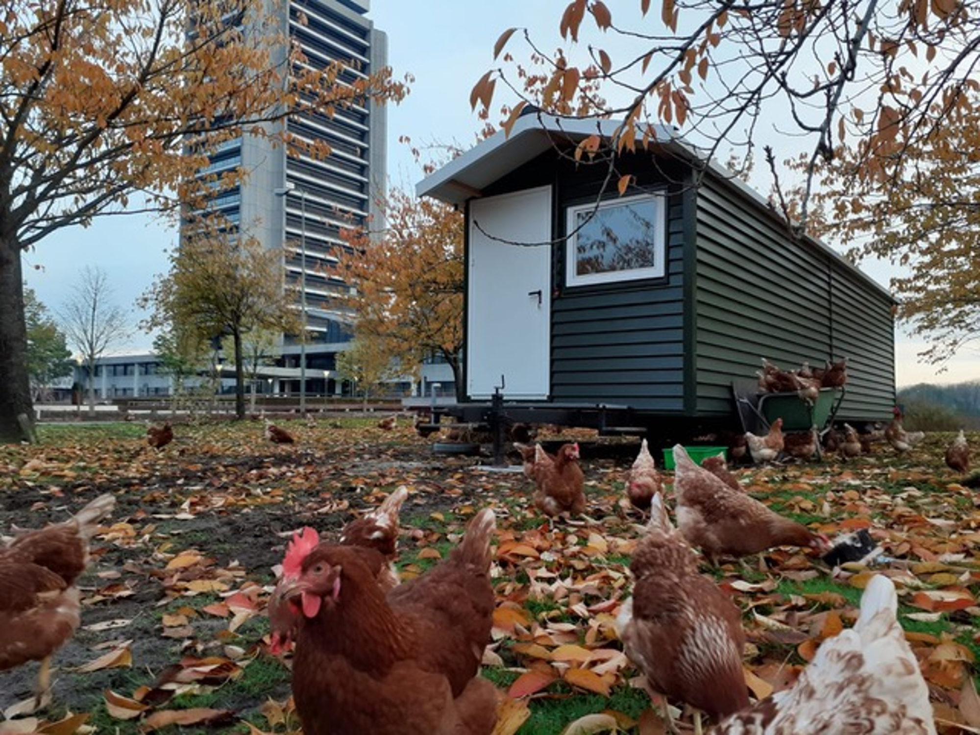 De groei zit er goed in. Fladderfarm Mobiel heeft al dertien kip-caravans staan tussen Eindhoven, Den Bosch en Tilburg. Ze zijn voorzien van zonnepanelen en hebben een computer die ervoor zorgt dat ‘s avonds als de kippen op stok gaan de luiken sluiten, zodat de vos voor een gesloten deur staat. De meeste kip-caravans staan op een terrein van een zorgorganisatie, zoals bij Prisma, ASVZ en GGZ-E.